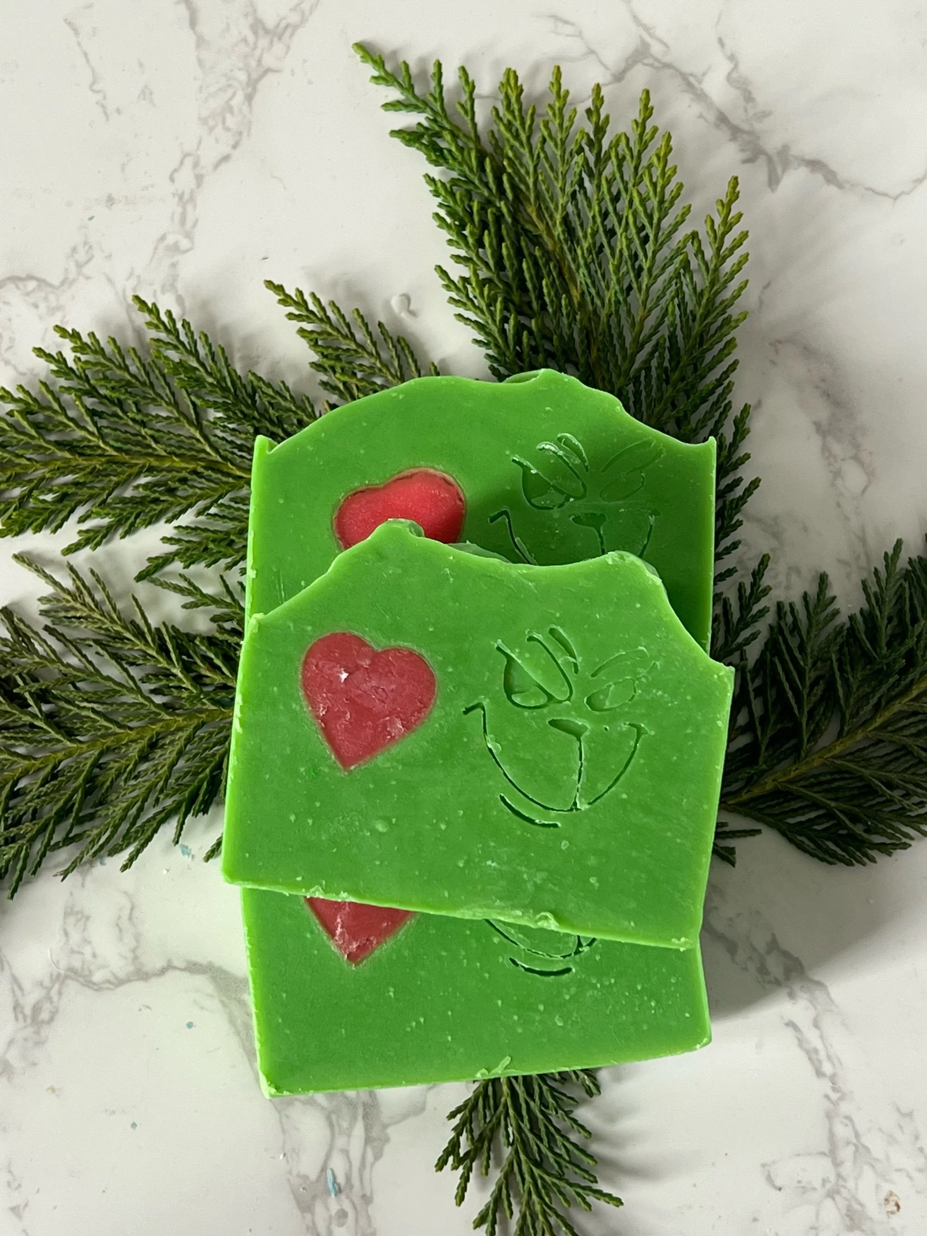 This soap bar smells of fir, white pine, clove, mistletoe berries, pink grapefruit, frosted lily, and pineapple, and who doesn’t like The Grinch?